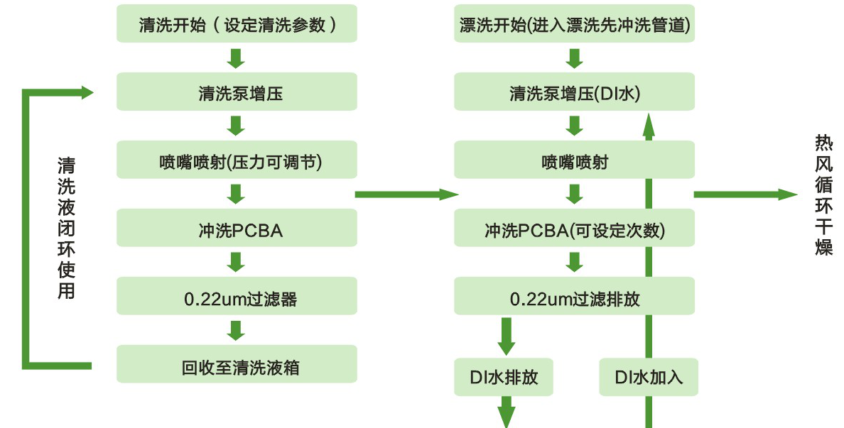 1.全面的清洗系統(tǒng): 針對(duì)SMT/THT的PCBA焊接后表面殘留的松香,免清洗型助焊劑,水溶性助焊劑等有機(jī)、無(wú)機(jī)污染物進(jìn)行徹底有效的清洗。